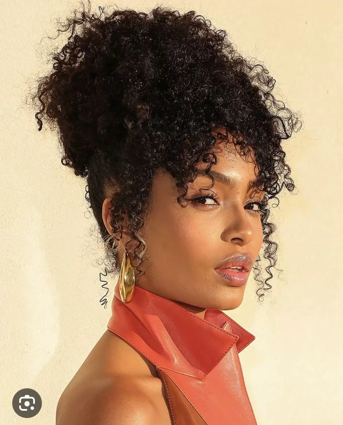 Para mulheres com cabelos crespos, o afro puff alto é prático, poderoso e cheio de personalidade. Use um elástico largo ou um lenço para prender bem no alto da cabeça.