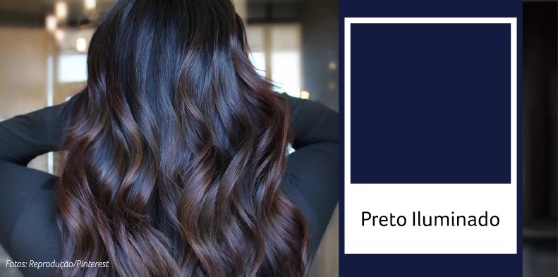 O preto não sai de moda, mas para 2025 ele ganha um toque especial com reflexos sutis em azul ou castanho. Esse efeito traz mais brilho e profundidade ao cabelo, criando um look sofisticado e moderno.