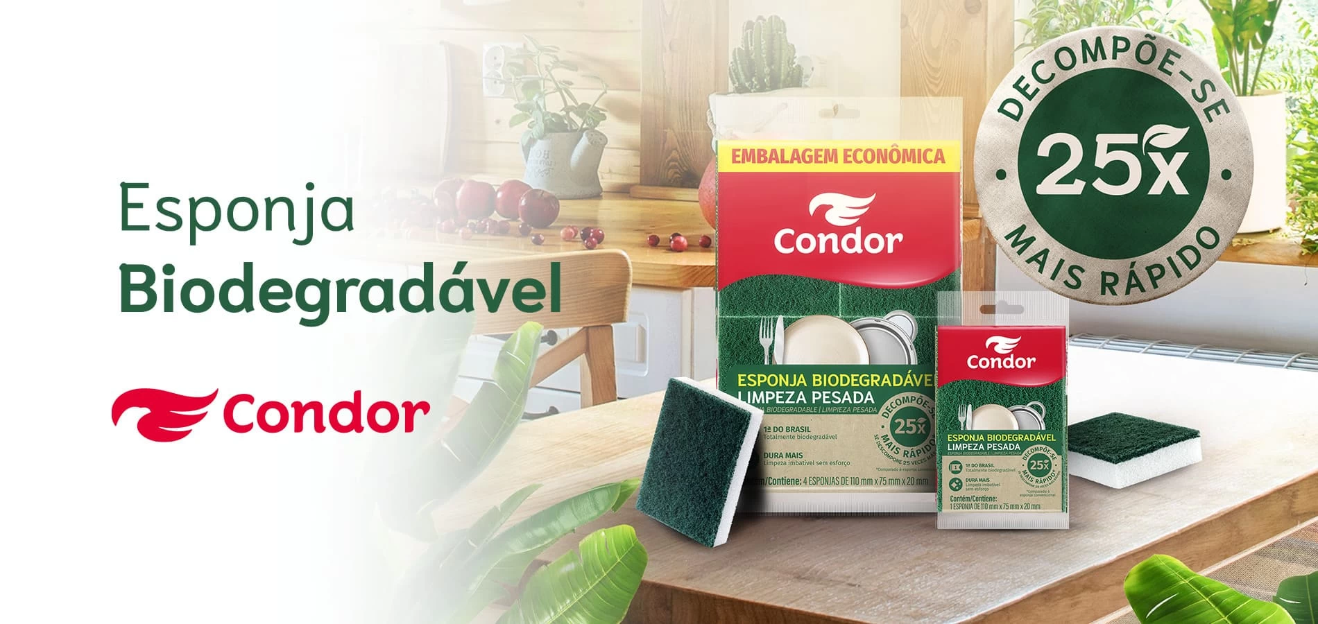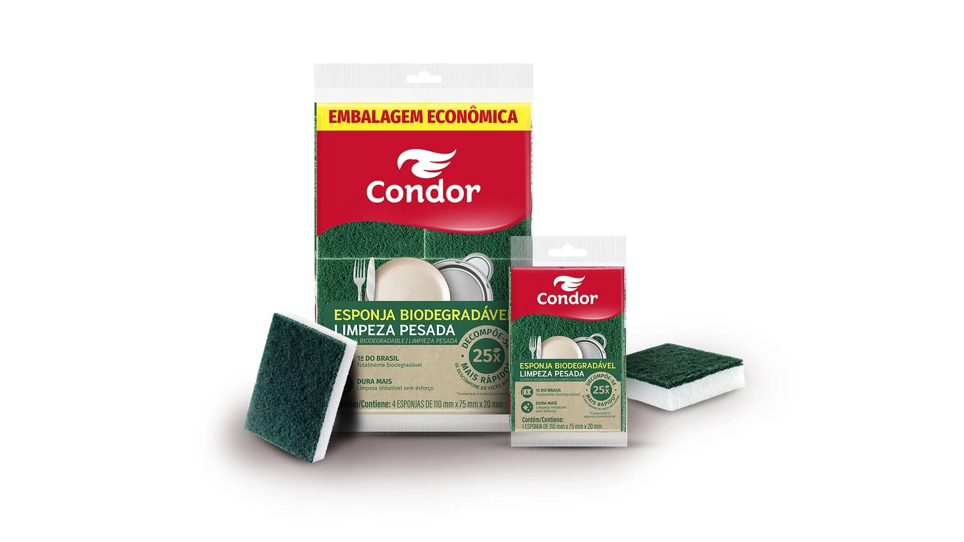 Lançada em maio na APAS Show, a Esponja Biodegradável Condor é um marco na história da marca. Desenvolvida com tecnologia de ponta, ela contém um aditivo orgânico incorporado à sua formulação ainda na fase inicial da produção. Esse aditivo é o responsável por acelerar o processo de decomposição da esponja, tornando-a 100% biodegradável em ambiente anaeróbico. A decomposição ocorre até 25 vezes mais rápido do que nas esponjas convencionais, que podem levar de 100 a 600 anos para desaparecer do meio ambiente. O produto foi testado e certificado de acordo com o método de análise ASTM D 5511-11, que comprova sua biodegradabilidade em ambiente anaeróbico por ação microbiana.