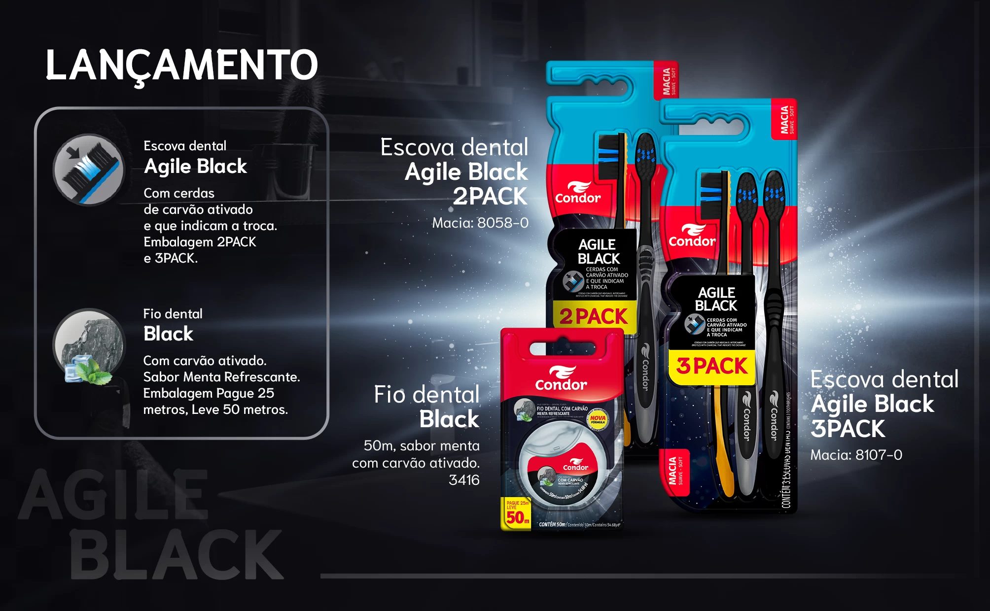 A grande aposta da marca para o canal farma em 2025 é a nova Escova Dental Condor Agile Black, desenvolvida com foco em desempenho, conforto e preço acessível.