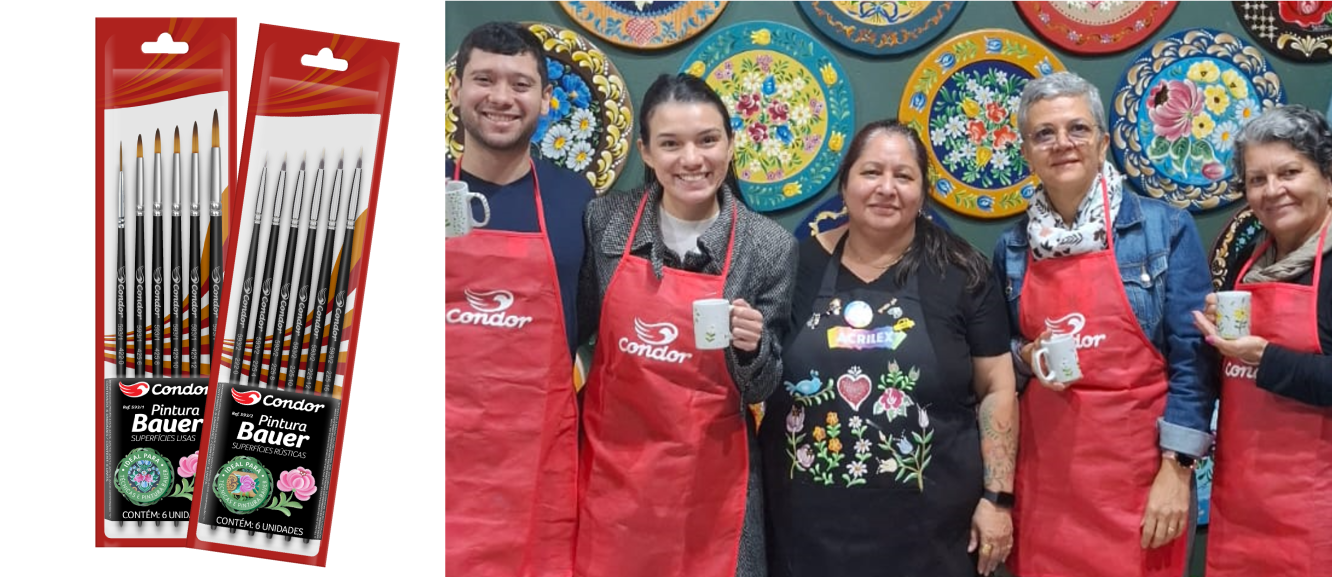 A valorização da técnica ganhou um aliado importante: a Condor. A empresa não só apoiou desde o início a Semana Cultural da Pintura Bauer como, em 2024, lançou dois kits especiais para a prática: um para superfícies rústicas (Ref. 593/2) e outro para superfícies lisas (Ref. 593/1.