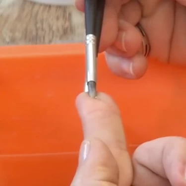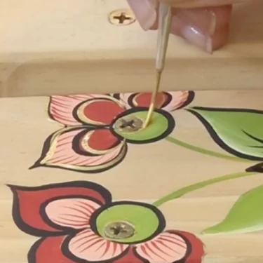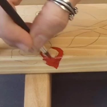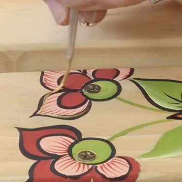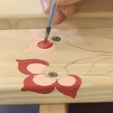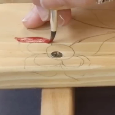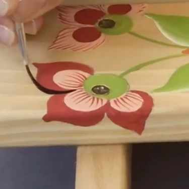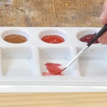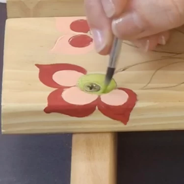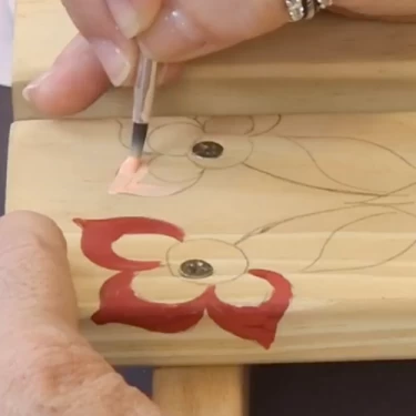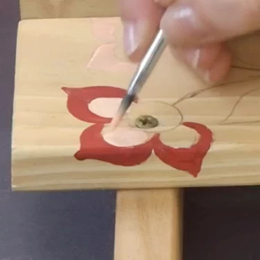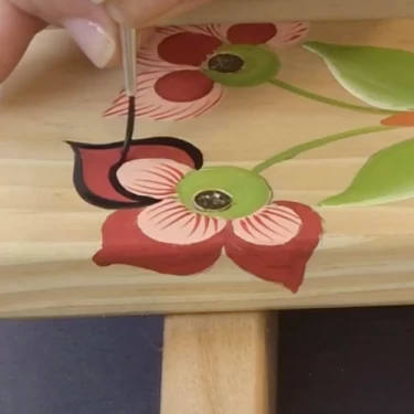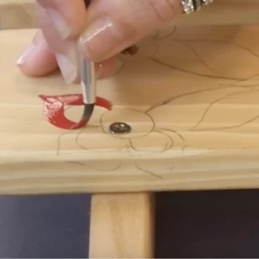Com o pincel redondo nº10 do kit e a tinta vermelha, pincele a lateral de uma pétala, iniciando com a ponta do pincel, pressionando-o ao longo da pétala e levantando-o ao final.