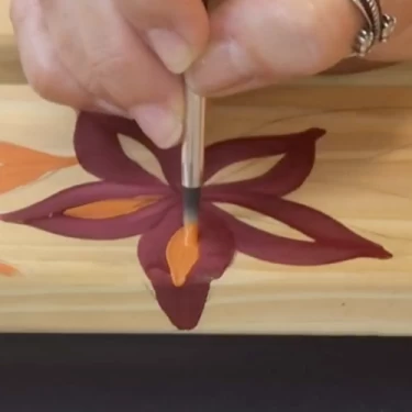 Carregue a ponta do pincel redondo nº16 do kit na tinta laranja. Pinte a parte externa das pétalas da flor maior do motivo.