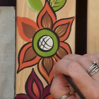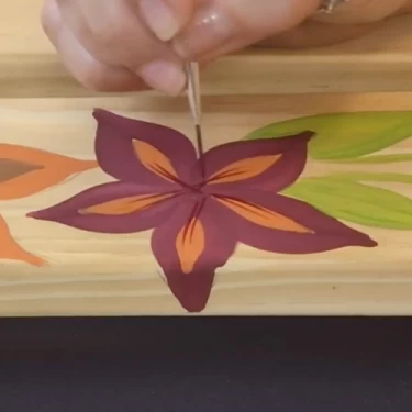 Com a cor vinho diluída em água, faça os tracinhos no centro das pétalas pintadas de laranja.