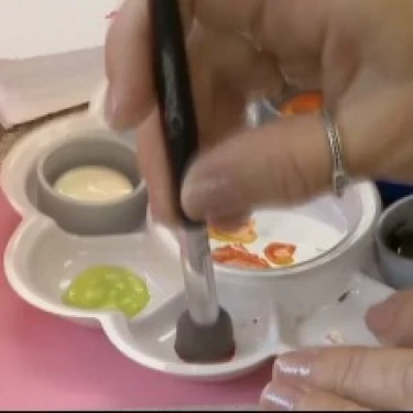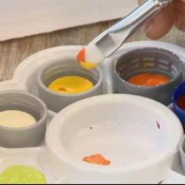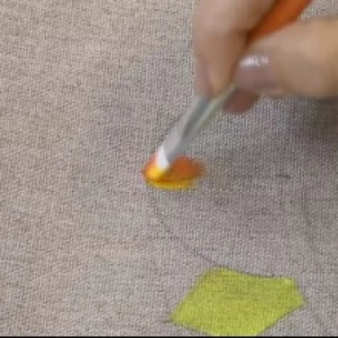 Carregue uma lateral do pincel língua de gato com a tinta Amarela e a outra lateral com a tinta Laranja.