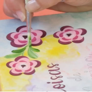 Com o pincel 514-12 e a mistura das tintas verde e rosa-bebê, pincele um caule entre duas flores.