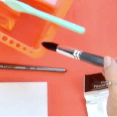 Hidrate o pincel redondo maior do kit na água e encoste a ponta na bandeja apenas para retirar o excesso.