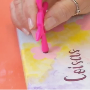 Posicione o estêncil de flores sobre a tampa da caixa. Misture as tintas branca e rosa no pituá e preencha três flores.
