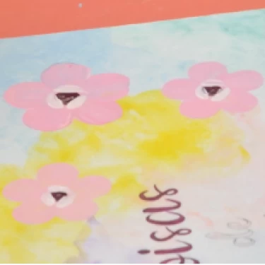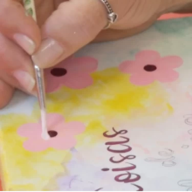 Carregue a ponta fina do pinta bolinhas na tinta rosa-bebê e faça 3 pontinhos sobre o miolo das flores.