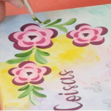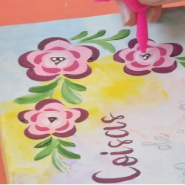 Faça uma vírgula no contorno de cada pétala, utilizando a tinta vinho no pincel. Desenhe diversas flores sobre a tampa.
