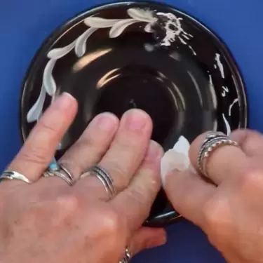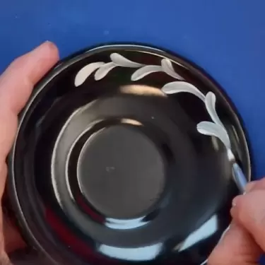 Carregue o pincel redondo na tinta branca e faça os arabescos em toda a volta do pratinho, fazendo uma pincelada para a direita e outra para a esquerda.