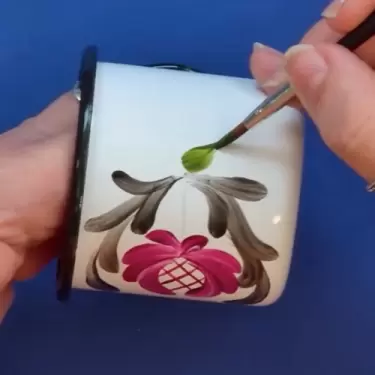 Carregue o pincel redondo nas tintas verde e preta. Desenhe uma folha na lateral do motivo, pressionando e levantando o pincel.