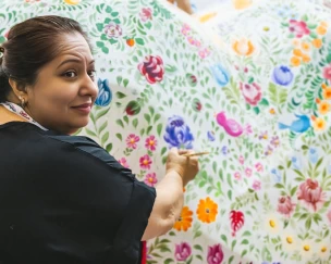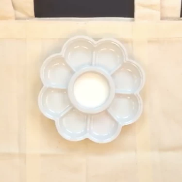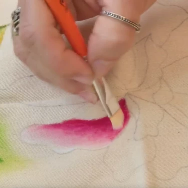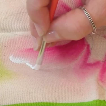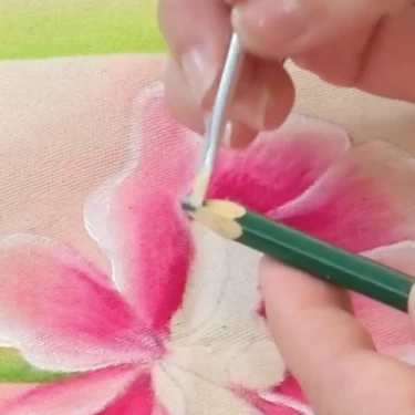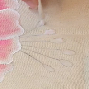 Carregue o pincel faca 347-4 do kit na tinta para tecido branca e realce os contornos internos das pétalas da flor.