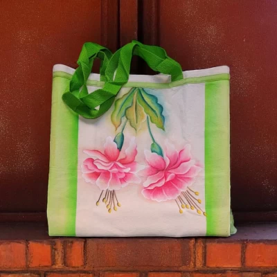 Coloque a placa de MDF com cola permanente dentro da ecobag e proteja a parte superior da ecobag com a fita crepe.