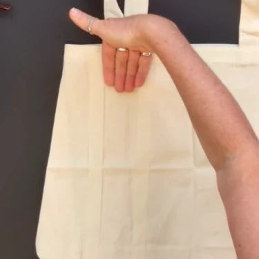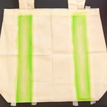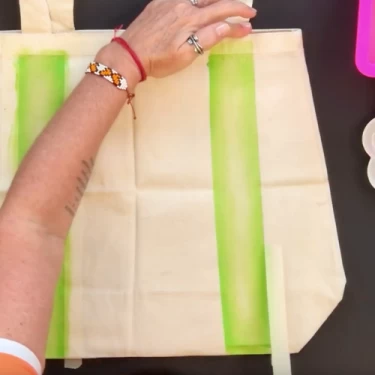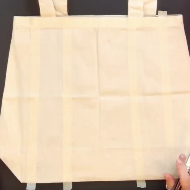 Passe a fita crepe duas vezes nas laterais da ecobag, pela vertical, deixando uma distância de três dedos entre as fitas.