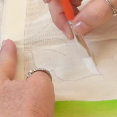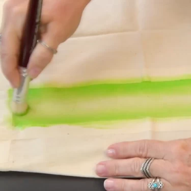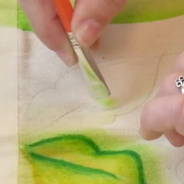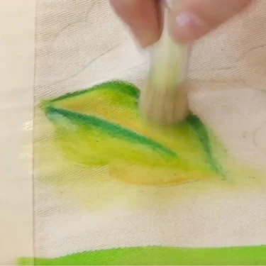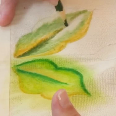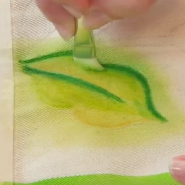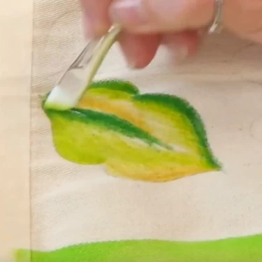 Carregue o pincel faca no diluente para tecido e pincele a folha, mesclando as cores.