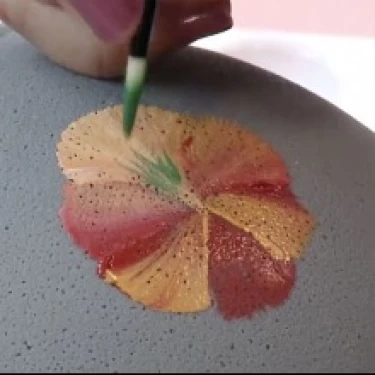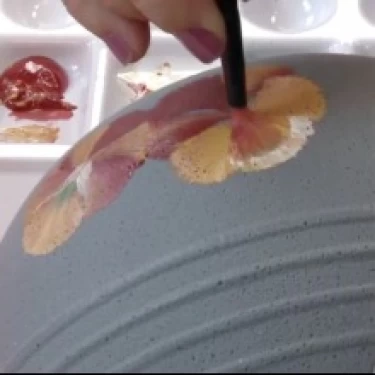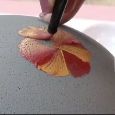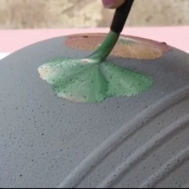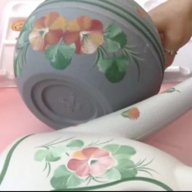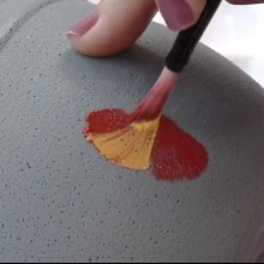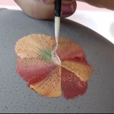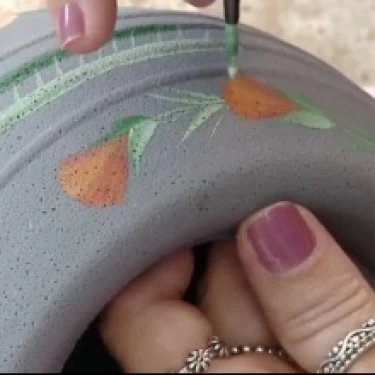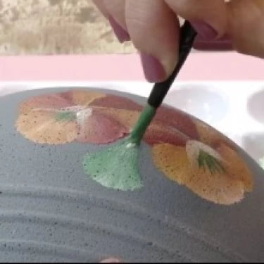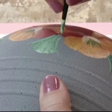 Desenhe alguns botões nas bordas do cachepô, pincelando apenas uma pétala com as tintas Telha e Mostarda.