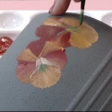 Carregue o pincel com as tintas Telha e Mostarda. Desenhe a segunda pétala da flor Amor-perfeito.