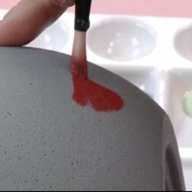 Com a tinta Telha no pincel, desenhe uma pétala com movimento de flexibilidade. Caso sinta maior segurança, desenhe o círculo a lápis sobre o cachepô de plástico.