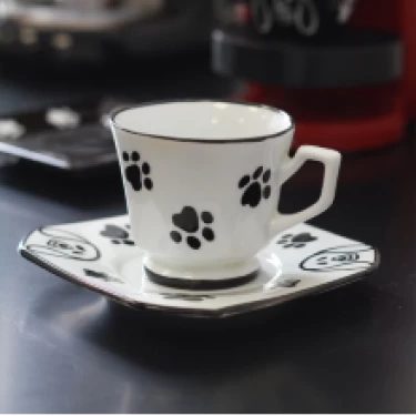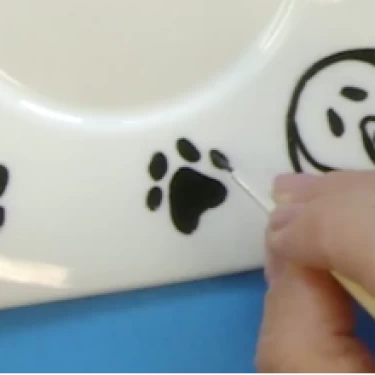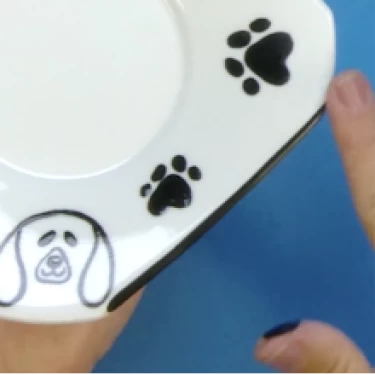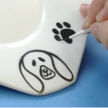 Na xícara, desenhe apenas as almofadas das patinhas e leve à queima. E o conjunto está pronto!