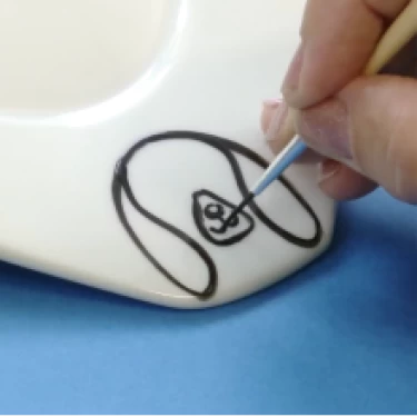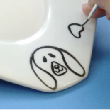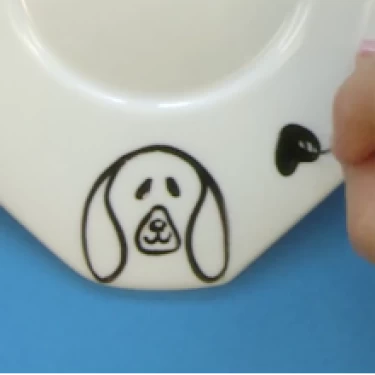 Com mesma tinta e pincel, faça um i no centro do focinho, formando o nariz e a boca do cachorro. Repita o desenho no canto oposto do prato.