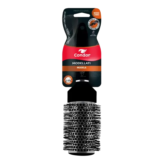 Escova para cabelos Modellati contém cerdas com íons negativos, que evitam o frizz nos cabelos. Base vazada em cerâmica, retém o calor do secador, agilizando o “brushing” sem danificar os cabelos. Cabo emborrachado que proporciona maior ergonomia e firmeza ao escovar. Diâmetro de 53 mm. Para cabelos superlongos.