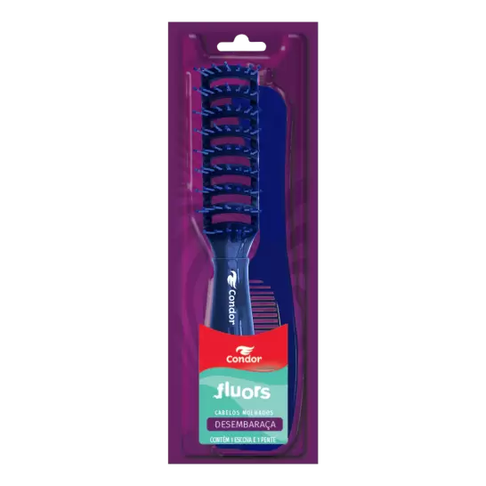 Praticidade para o dia a dia! O kit Fluors conta com a Escova Vazada 6803, ideal para auxiliar na secagem e modelagem dos cabelos, além de acompanhar um pente K8 grátis. Um combo funcional que ajuda a desembaraçar, alinhar e cuidar dos fios com mais facilidade.