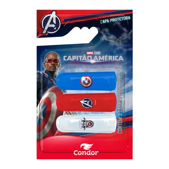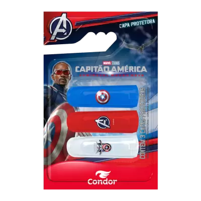 Além do Escudo protetor do Capitão América, temos as Capas Protetoras para proteger as escovas dentais. Kit com três capas protetoras de cerdas, personalizadas com adesivo do Capitão América, com uma exclusiva tampinha flip-flop que facilita o uso.