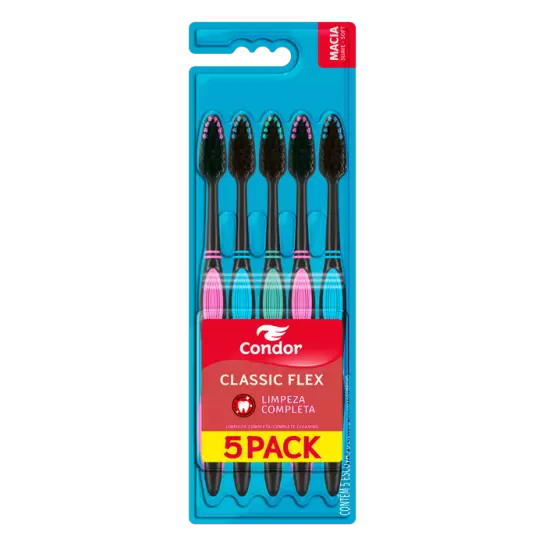 Escova Dental Classic Flex , cerdas macias em corte reto, com limpador de língua que ajuda a eliminar as bactérias que causam o mau hálito. Disponível em duas cores rosa e azul.