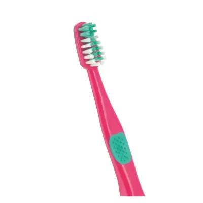 Com cabo que se encaixa perfeitamente na mão das crianças, possui limpador de língua emborrachado e cerdas frontais mais altas para facilitar a escovação dos dentes lá do fundo.