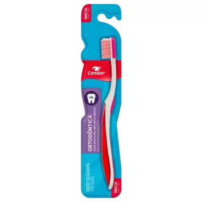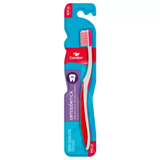 Escova dental perfeita para quem usa aparelho ortodôntico. As cerdas mais baixas do centro da escova acomodam os braquetes dos aparelhos enquanto que as cerdas laterais, mais altas, alcançam os dentes. Com limpador de língua. Pode ser usado normalmente por pessoas que não utilizam aparelho ortodôntico. Acompanha capa protetora de cerdas. Disponível na versão Macia com 4 combinações de cores