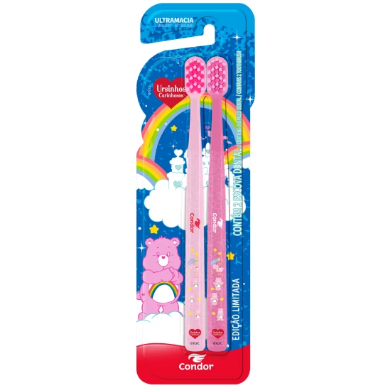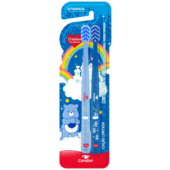 Possui cerdas ultramacias que limpam com suavidade e protegem a gengiva. Com design exclusivo dos Ursinhos Carinhosos, cada escovação se transforma em um momento alegre e encantador. Embalagem 2 pack para dobrar o cuidado do seu dia!