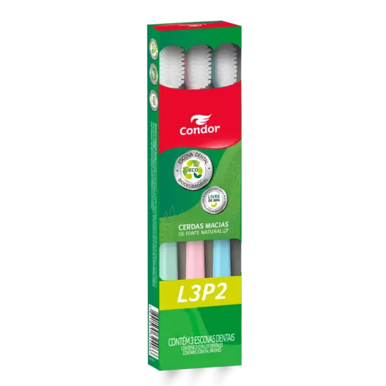 Descrição: Pensando na proteção do nossa planeta, desenvolvemos a escova dental Condor ECO. Cabo biodegradável, se decompões em até dois anos na natureza. * Material Biodegradável conforme Norma ISO 14855-2/2018. Com cerdas macias, e de fonte natural, proporciona conforto durante a escovação para uma higiene bucal mais saudável. Disponivel em 4 cores, azul, rosa, verde e branca. Dica ECO: Com o desgaste das cerdas, descarte o cabo para a compostagem.