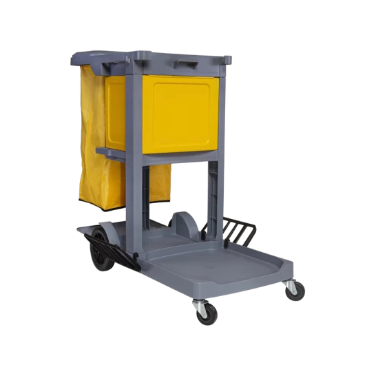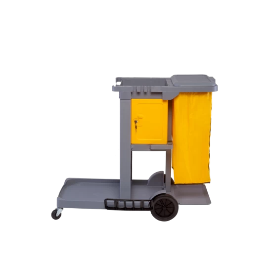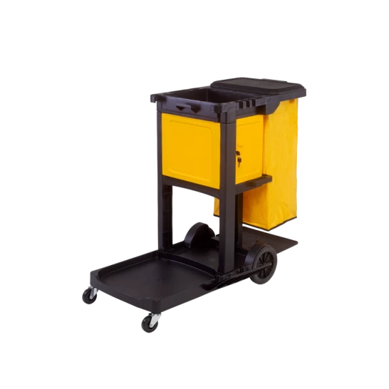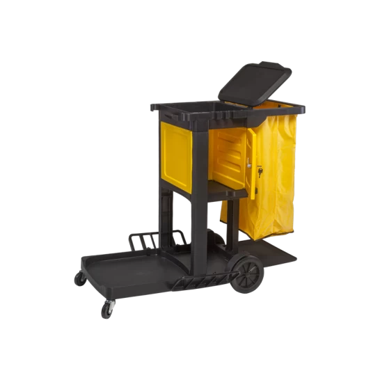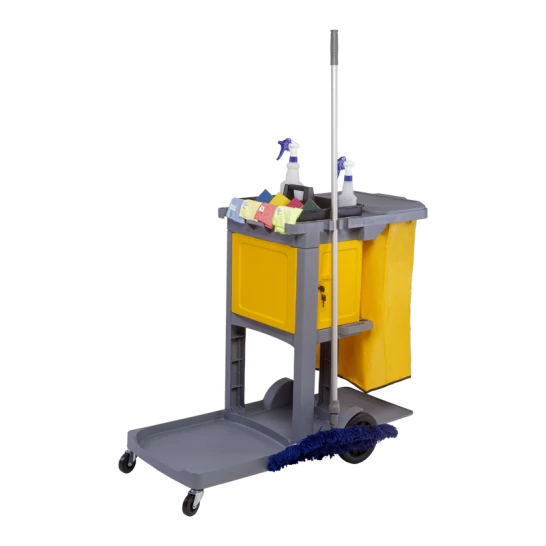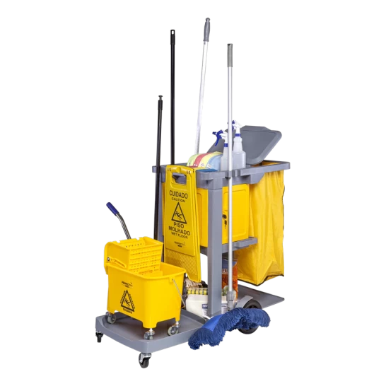 Carro funcional compacto equipado com porta e asa para transporte e organização de equipamentos de limpeza.